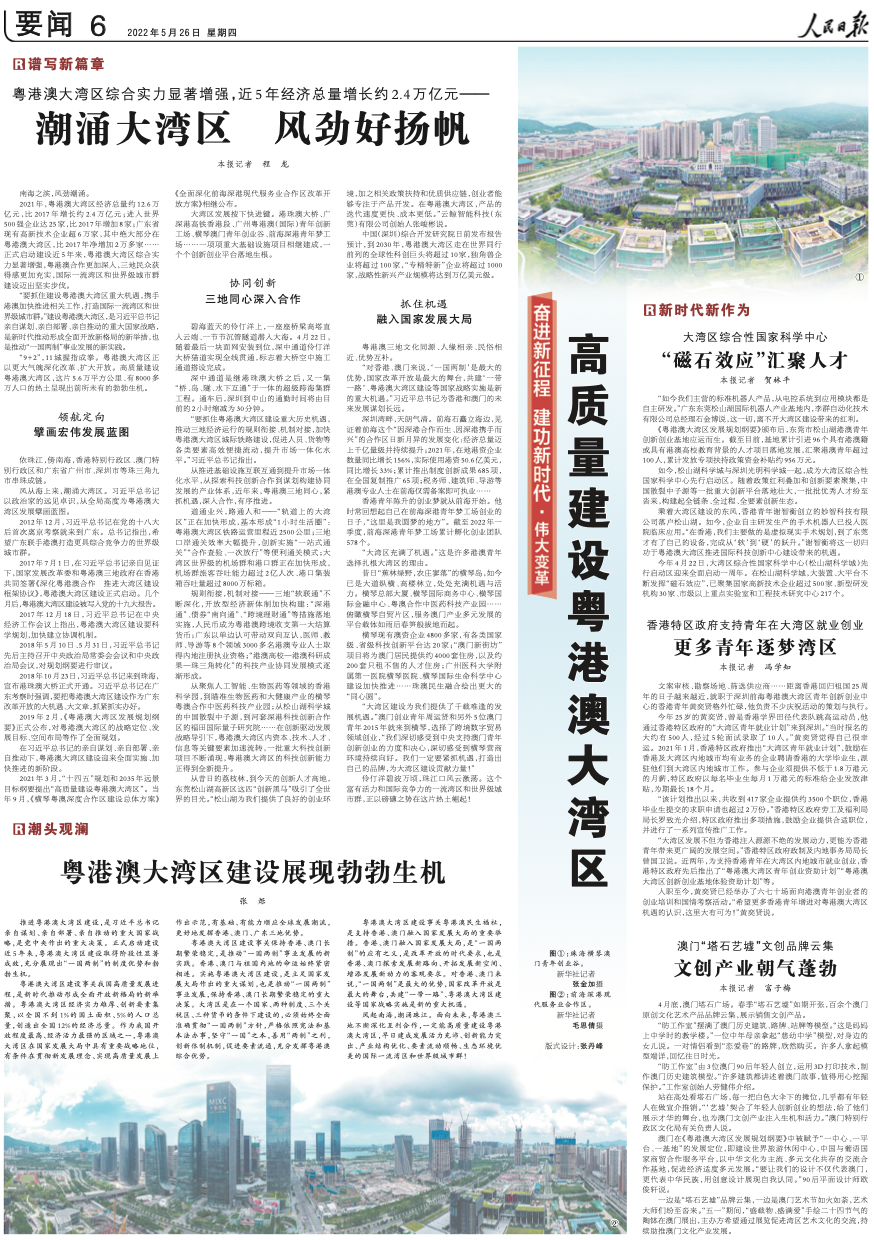 粵港澳三地文化同源、人緣相親、民俗相近、優(yōu)勢互補。“對香港、澳門(mén)來(lái)說(shuō),‘一國兩制’是最大的優(yōu)勢,國家改革開(kāi)放是最大的舞臺,共建‘一帶一路’、粵港澳大灣區建設等國家戰略實(shí)施是新的重大機遇。”習近平總書(shū)記為香港和澳門(mén)的未來(lái)發(fā)展謀劃長(cháng)遠。深圳灣畔,天朗氣清。前海石矗立海邊,見(jiàn)證著(zhù)前海這個(gè)“因深港合作而生、因深港攜手而興”的合作區日新月異的發(fā)展變化:經(jīng)濟總量邁上千億量級并持續提升;2021年,在地港資企業(yè)數量同比增長(cháng)156%,實(shí)際使用港資50.6億美元,同比增長(cháng)33%;累計推出制度創(chuàng )新成果685項,在全國復制推廣65項;稅務(wù)師、建筑師、導游等港澳專(zhuān)業(yè)人士在前海僅需備案即可執業(yè)……香港青年陳升的創(chuàng )業(yè)夢(mèng)就從前海開(kāi)始。他時(shí)?;叵肫鹱约涸谇昂I罡矍嗄陦?mèng)工場(chǎng)創(chuàng )業(yè)的日子,“這里是我圓夢(mèng)的地方”。截至2022年一季度,前海深港青年夢(mèng)工場(chǎng)累計孵化創(chuàng )業(yè)團隊578個(gè)。“大灣區充滿(mǎn)了機遇。”這是許多港澳青年選擇扎根大灣區的理由。昔日“蕉林綠野,農莊寥落”的橫琴島,如今已是大道縱橫、高樓林立,處處充滿(mǎn)機遇與活力。橫琴總部大廈、橫琴?lài)H商務(wù)中心、橫琴?lài)H金融中心、粵澳合作中醫藥科技產(chǎn)業(yè)園……俯瞰橫琴自貿片區,服務(wù)澳門(mén)產(chǎn)業(yè)多元發(fā)展的平臺載體如雨后春筍般拔地而起。橫琴現有澳資企業(yè)4800多家,有各類(lèi)國家級、省級科技創(chuàng )新平臺達20家;“澳門(mén)新街坊”項目將為澳門(mén)居民提供約4000套住房,以及約200套只租不售的人才住房;廣州醫科大學(xué)附屬第一醫院橫琴醫院、橫琴?lài)H生命科學(xué)中心建設加快推進(jìn)……珠澳民生融合繪出更大的“同心圓”。“大灣區建設為我們提供了千載難逢的發(fā)展機遇。”澳門(mén)創(chuàng )業(yè)青年周運賢和另外5位澳門(mén)青年2015年就來(lái)到橫琴,選擇了跨境數字貿易領(lǐng)域創(chuàng )業(yè),“我們深切感受到中央支持澳門(mén)青年創(chuàng )新創(chuàng )業(yè)的力度和決心,深切感受到橫琴營(yíng)商環(huán)境持續向好。我們一定要緊抓機遇,打造出自己的品牌,為大灣區建設貢獻力量!”伶仃洋碧波萬(wàn)頃,珠江口風(fēng)云激蕩。這個(gè)富有活力和國際競爭力的一流灣區和世界級城市群,正以磅礴之勢在這片熱土崛起!